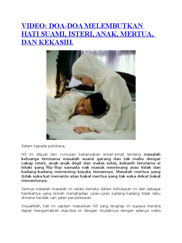 Dec 21 2011 Doa-doa di atas adalah cara dan ikhtiar kita untuk melembutkan hati insan yang dikasihi samaada isteri suami anak-anak ibu bapa adik beradik sahabat-sahabat dan sesiapa sahaja dengan niat dan hasrat untuk kebaikan. Doa Ketika Suami Istri Bersetubuh. Dec 20 2014 Doa Melembutkan Hati - Doa ini juga untuk meluluhkan hati orang yang kita cinta cintai.