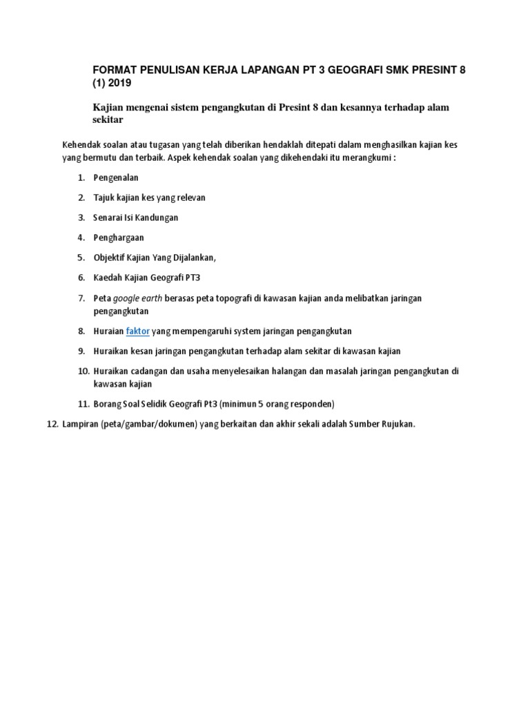 Proses Awal Geografi Pt3 20 markah Semestinya bahan kajian perlu disediakan untuk menyoalkan Tugasan geografi Pt3 dengan pelbagai kaedah kajian yang dipilih berserta sumber rujukan asli yang telah pun diperolehi bagi mendapatkan hasil kajian yang relevan. B Menyatakan dan menghuraikan jenis pengangkutan awam. MAJLIS PEPERIKSAAN MALAYSIA 1 KANDUNGAN Sukatan Pelajaran 942 Geografi Halaman Matlamat 3 Objektif 3 Huraian Sukatan Pelajaran 4 Bentuk Peperiksaan 38 Panduan Kajian Luar 39 Senarai Rujukan 46.